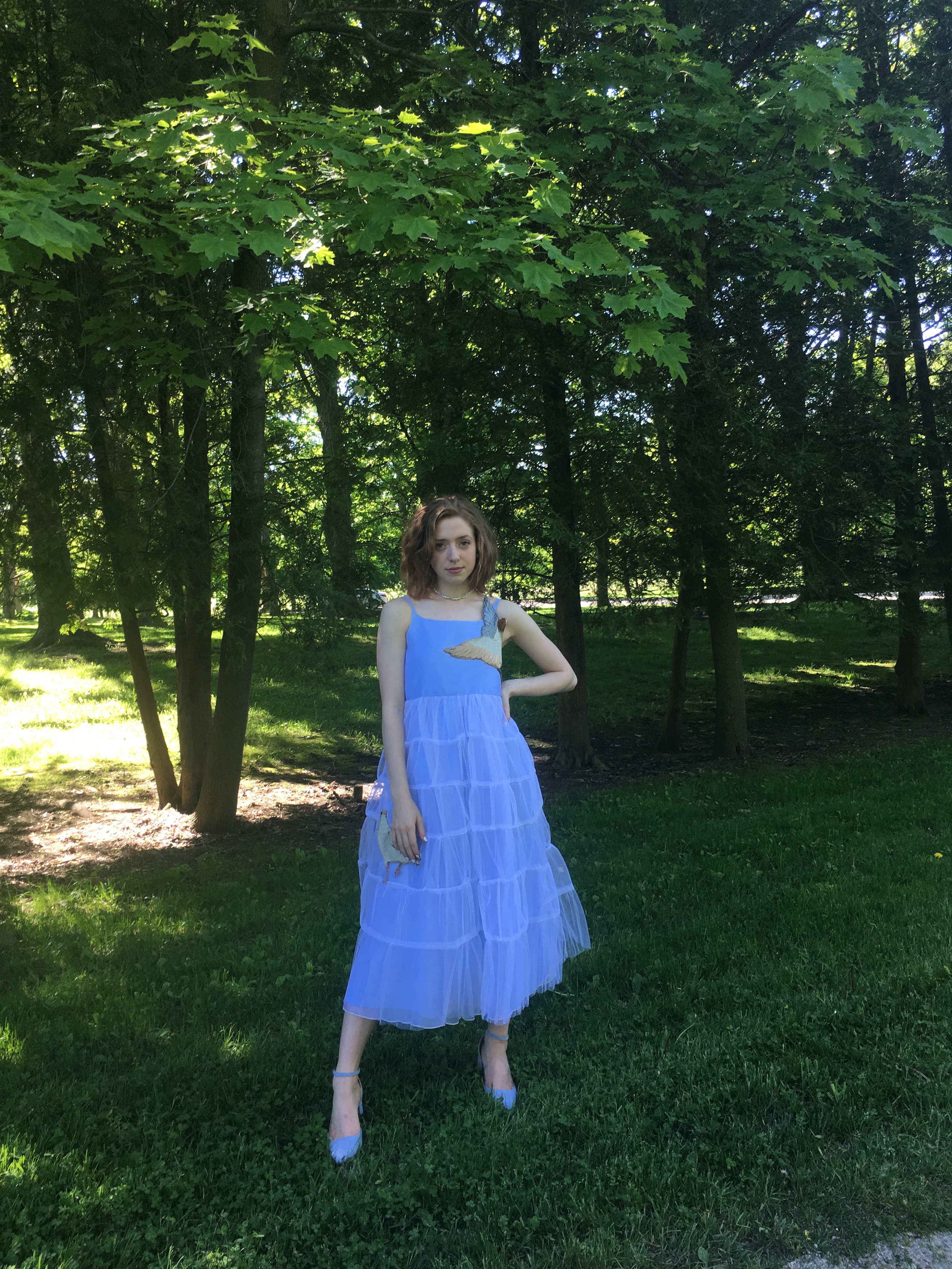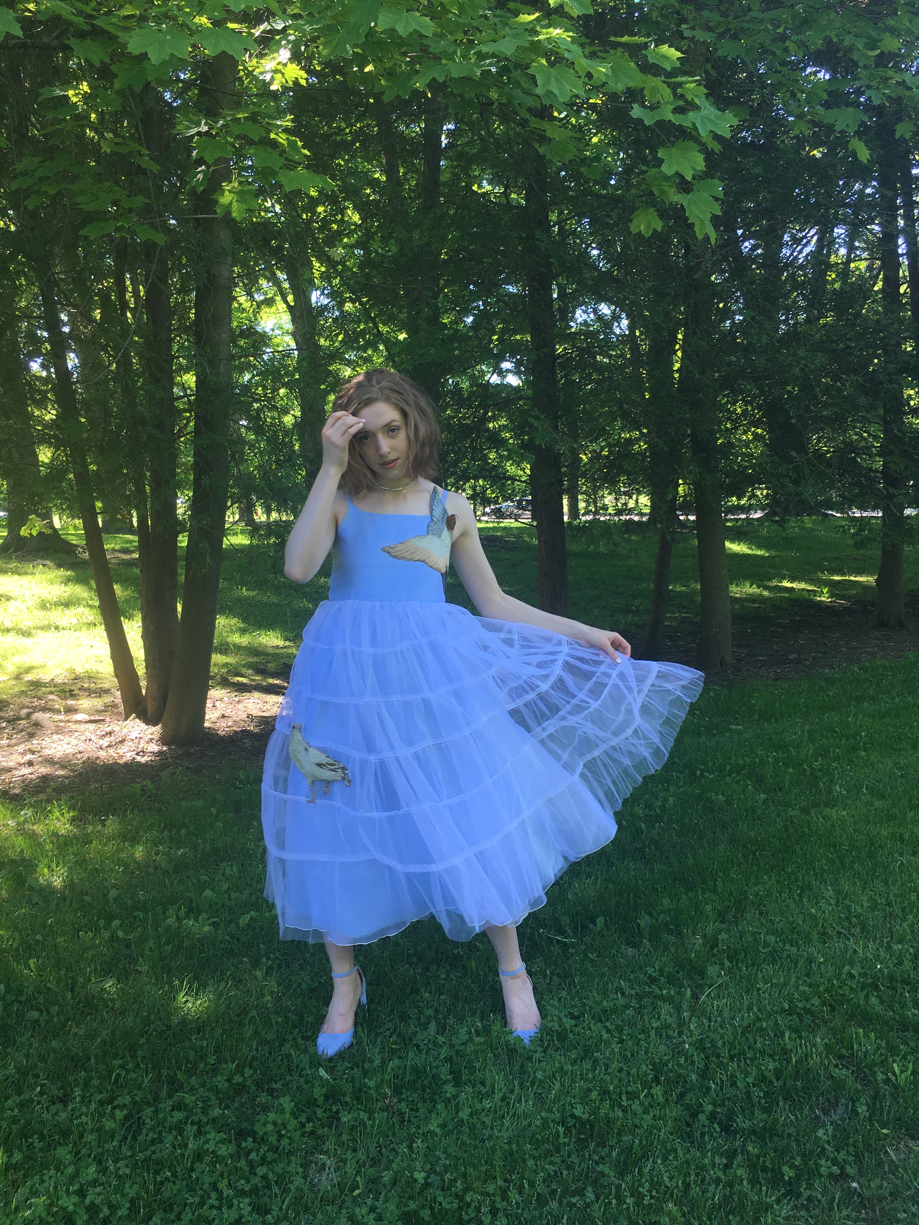 The pale blue base of my prom dress was purchased for only $15 at my local Goodwill. At first I didn’t even want to try it on, as it resembled a little too closely like my little sister’s cinderella costume (in style as well as size), and was made of a pretty thin, cheap fabric material (this is foreshadowing btw). However to my constant surprise, it always seems to be that whatever random item I grab on a whim right before I get to the dressing room, is what I end up leaving the store with (anyone relate?). The dress was not floor length which was my major hesitation in purchasing it, yet that ended up being the feature that I loved the most; not only did it show off my perfectly-matched pointed heels, but it also allowed the dress a more flowy quality when I walked and danced.